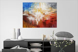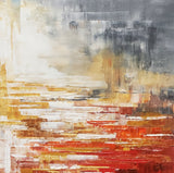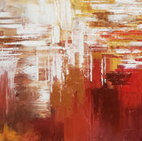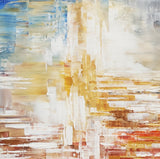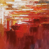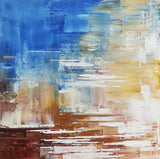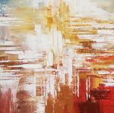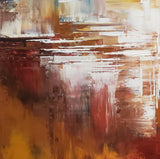 The painting combines rich blended tones of terra cotta reds, golden to earthy yellows and browns, and shades of blue, highlighted with a starburst of whites in the center of the canvas.