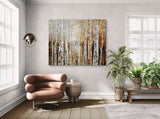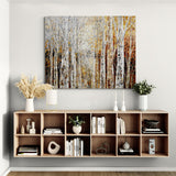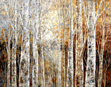Earthy colors, dominated by browns and grays, with hints of gold and silver, evoke the transition from autumn to winter in a birch and aspen forest. The scene is set along a forest river, creating a sense of depth and tranquility.